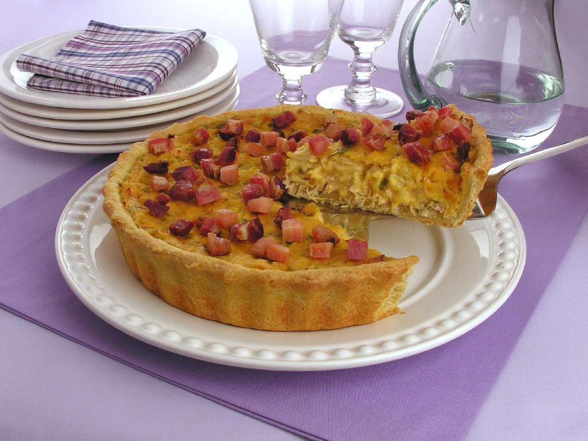 Para a massa, em uma vasilha, coloque a farinha, o ovo, o leite, a manteiga, o sal e misture até formar uma massa macia e homogênea. Se necessário, adicione mais leite. Abra a massa com um rolo e forre, com a massa, o fundo e as laterais de uma forma de aro removível de 24 cm de diâmetro untada. Coloque o recheio por cima. Leve ao forno médio, preaquecido, por 30 minutos ou até dourar. Desenforme, decore com o bacon e sirva.