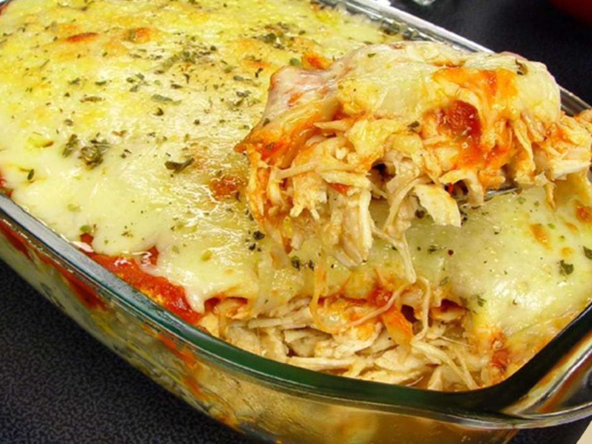 - Intercale em um refratário médio, camadas de frango e de muçarela, terminando em frango.