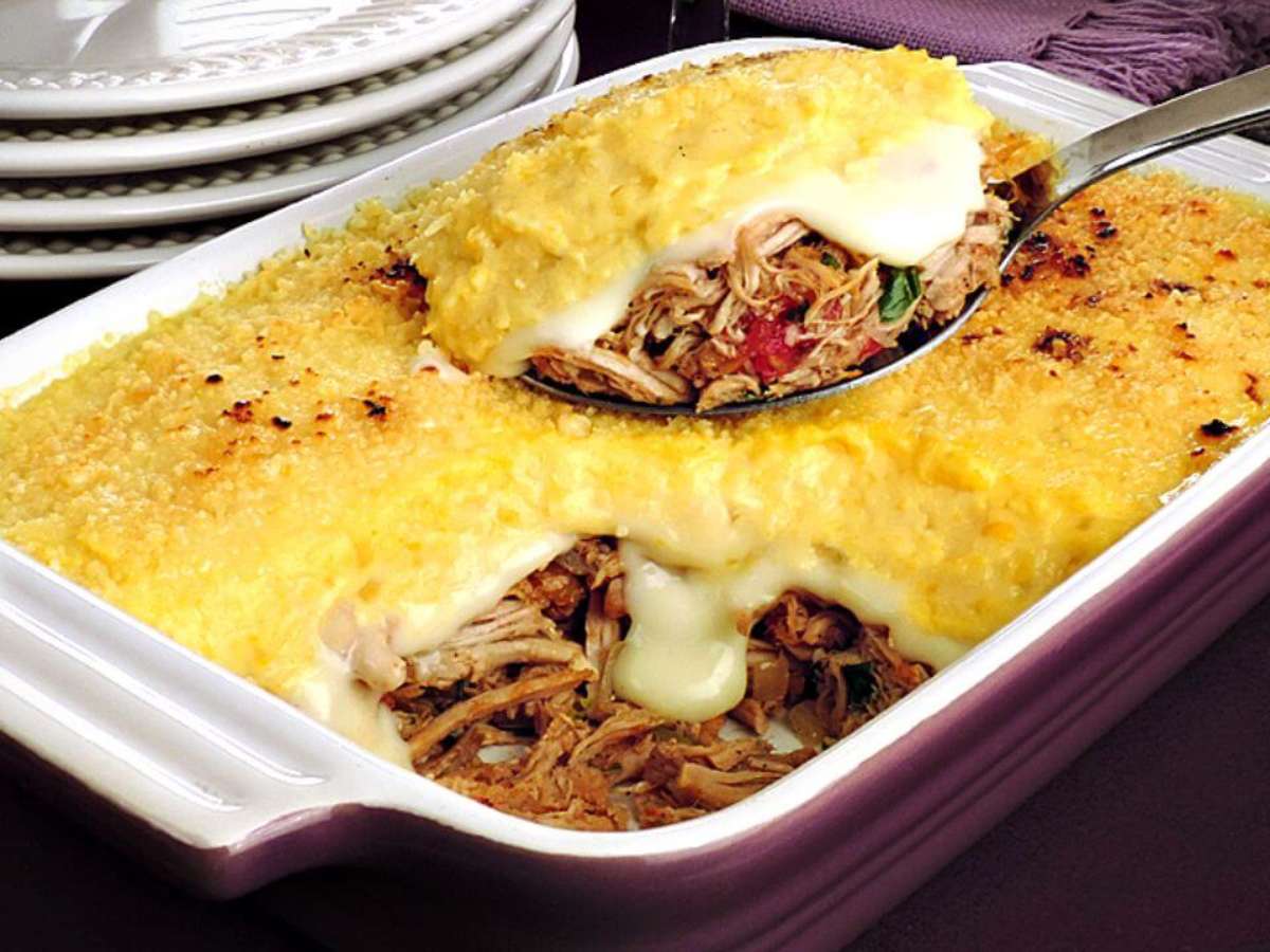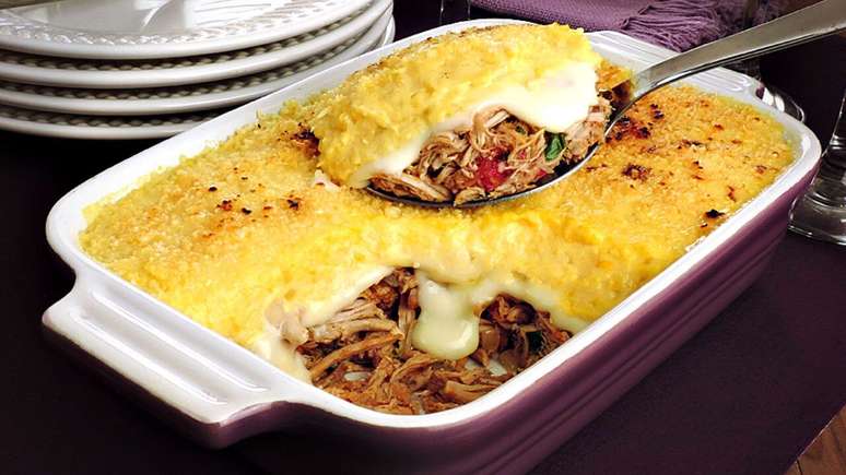 - Em um refratário untado, coloque o refogado de lombo, espalhe o requeijão e cubra com o creme de milho