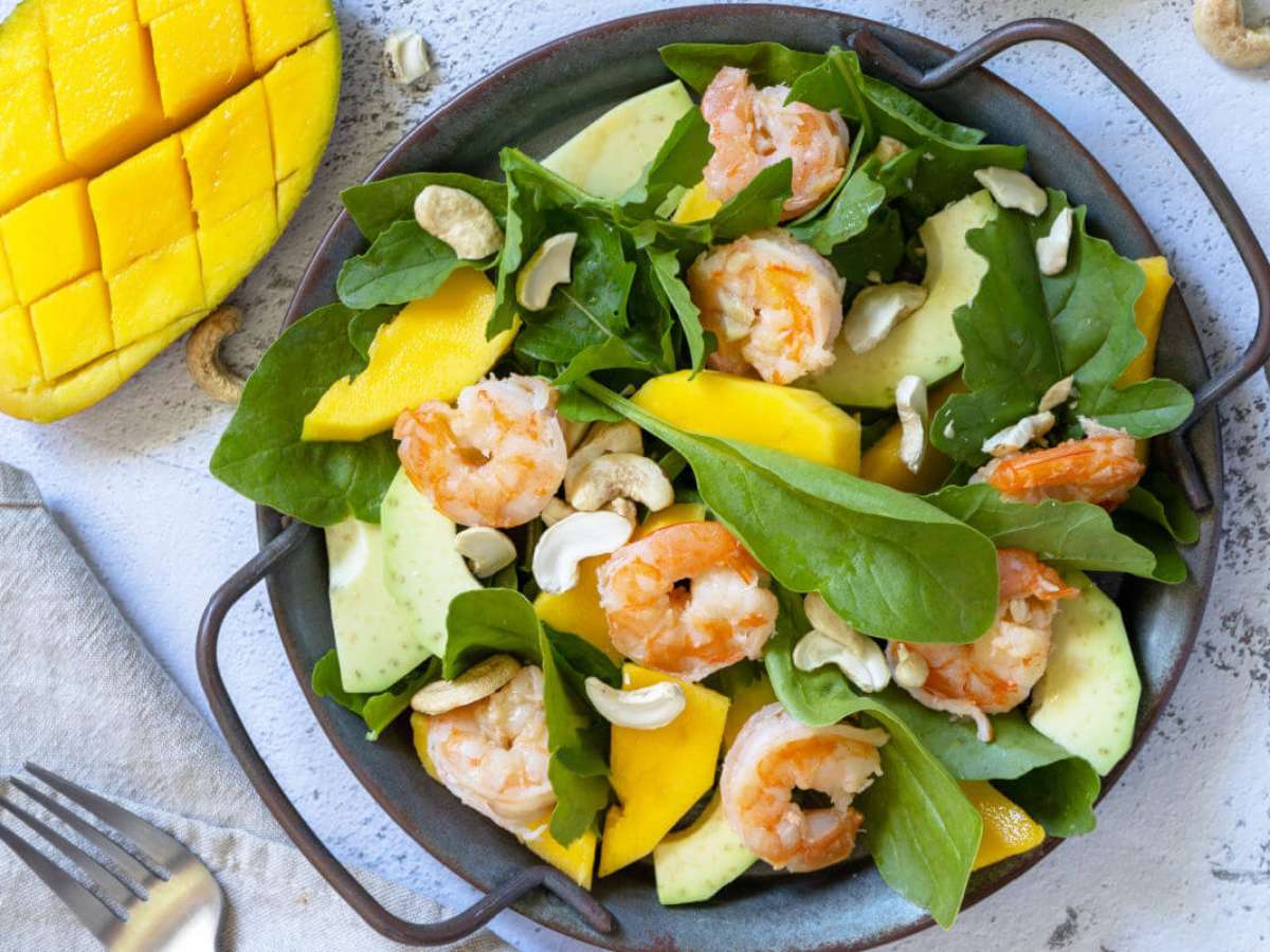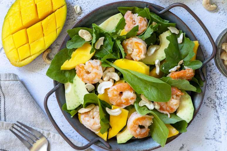 Em uma frigideira, aqueça 2 colheres de sopa de azeite de oliva em fogo médio e adicione o camarão. Tempere com sal e pimenta-do-reino. Tampe a frigideira e cozinhe por 10 minutos. Depois, retire a tampa e frite o camarão até atingir uma cor levemente dourada. Reserve. Em uma saladeira, misture as folhas de rúcula e de espinafre com o camarão, a manga, o abacate e a castanha-de-caju. Tempere a salada com o restante do azeite de oliva, o suco de limão, o sal e a pimenta-do-reino. Sirva em seguida.