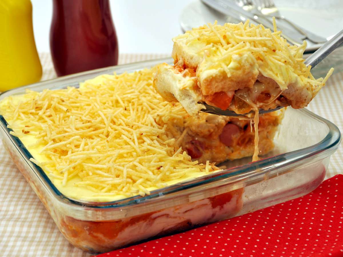 - Em um refratário grande, intercale camadas de pão, de maionese, de queijo e de molho, terminando em pão e maionese