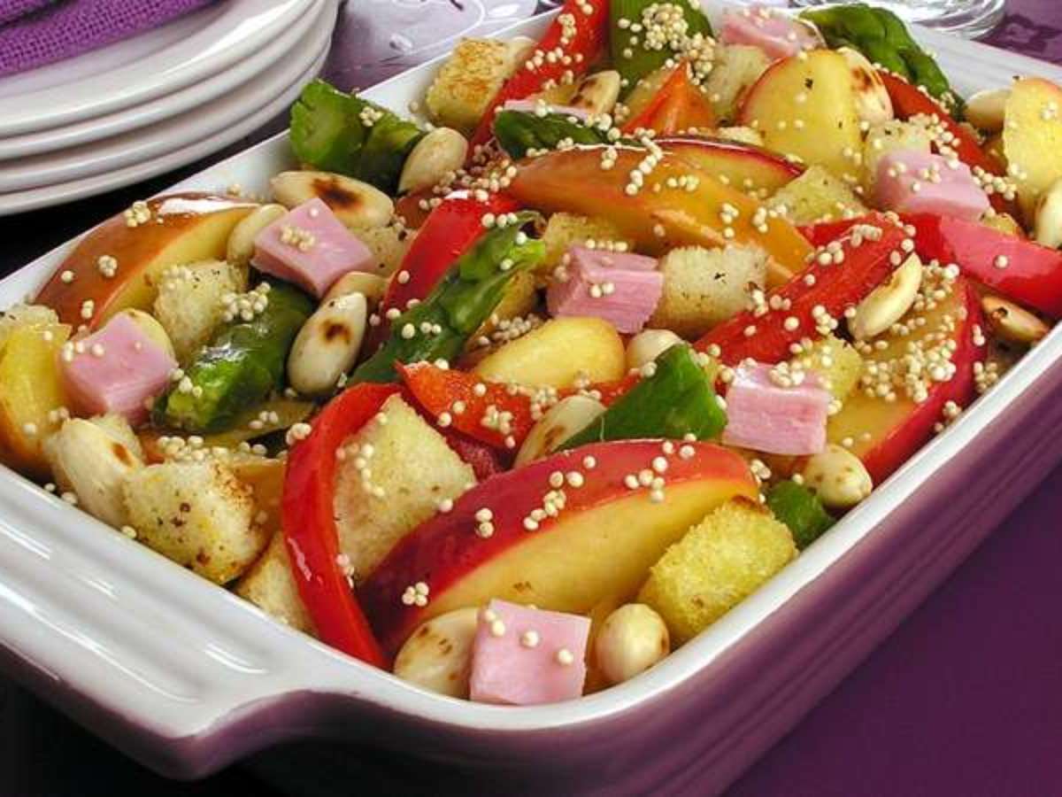 Em uma saladeira, misture a quinoa, os aspargos, as maçãs temperadas, o pão, as amêndoas, o presunto e sirva.