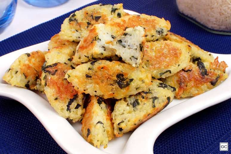 Coloque o arroz e o leite em uma tigela e amasse com um garfo. Adicione o espinafre, o parmesão, a farinha, o fermento, os ovos, sal e pimenta e misture.