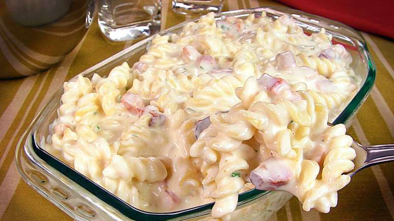 - Junte com o macarrão cozido e leve ao forno médio, preaquecido, por 10 minutos ou até gratinar