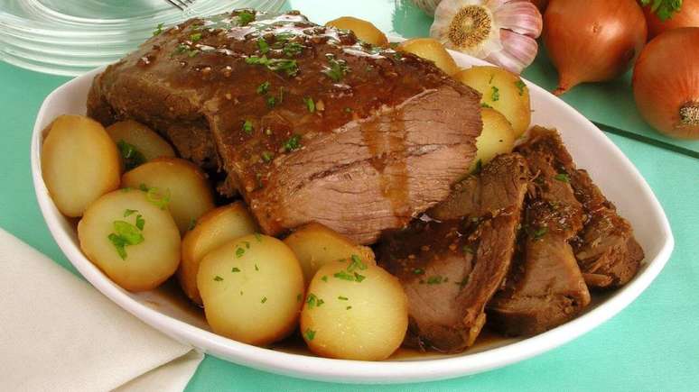 - Retire as batatas da panela e coloque ao redor da carne e regue com o molho que se formou na panela.