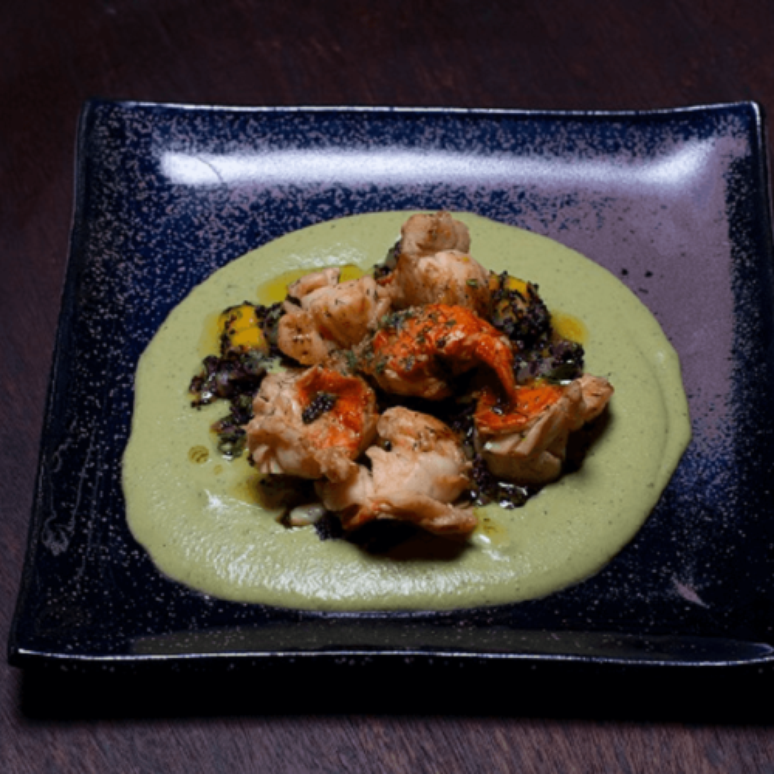Lagosta com salada de quinoa e creme de aspargos e ervilha.