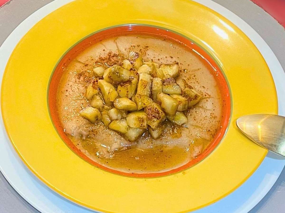 Mingau de aveia cremoso com água, sem leite e açúcar, com calda natural de banana dourada no mel. Perfeito e saudável