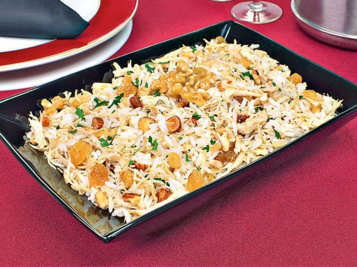 Aqueça uma panela com a manteiga e o azeite, em fogo médio, e frite o alho, a cebola e o arroz por 2 minutos. Adicione as uvas-passas, as nozes, as amêndoas, o frango e refogue por 2 minutos. Acrescente o champanhe, a água, sal e cozinhe com a panela semitampada, em fogo baixo, até a água secar. Solte o arroz com um garfo, transfira para uma travessa, decore com nozes, cheiro-verde e sirva em seguida.