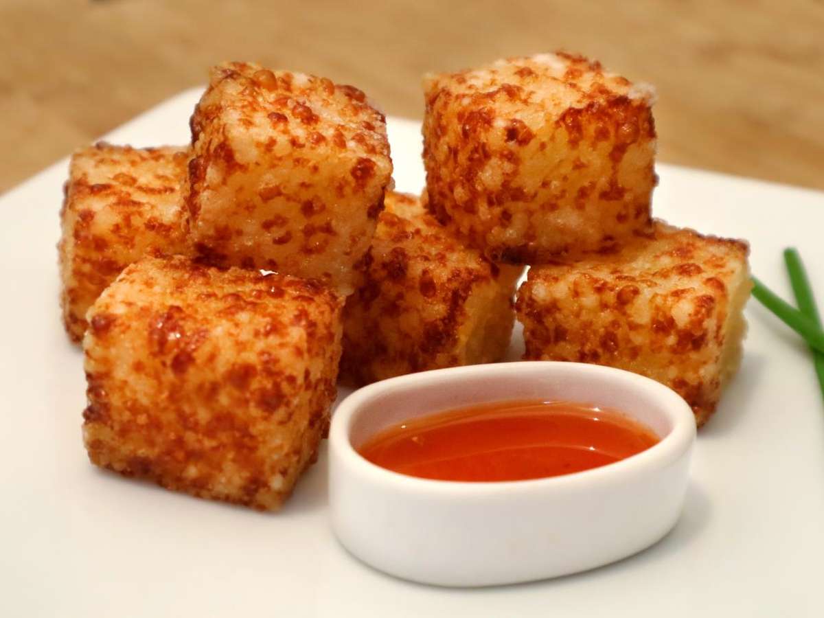 Pequenas porções dadinhos de tapioca como acompanhamento.