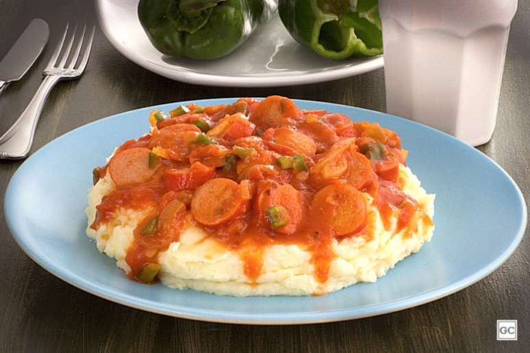 Purê de batata com molho de salsicha