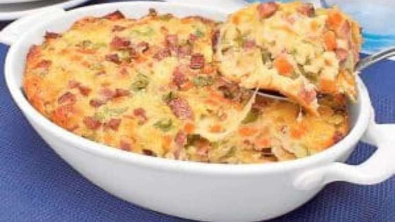 - Despeje em um refratário médio untado e leve ao forno médio, preaquecido, por 20 minutos ou até firmar e dourar. Deixe amornar e sirva.