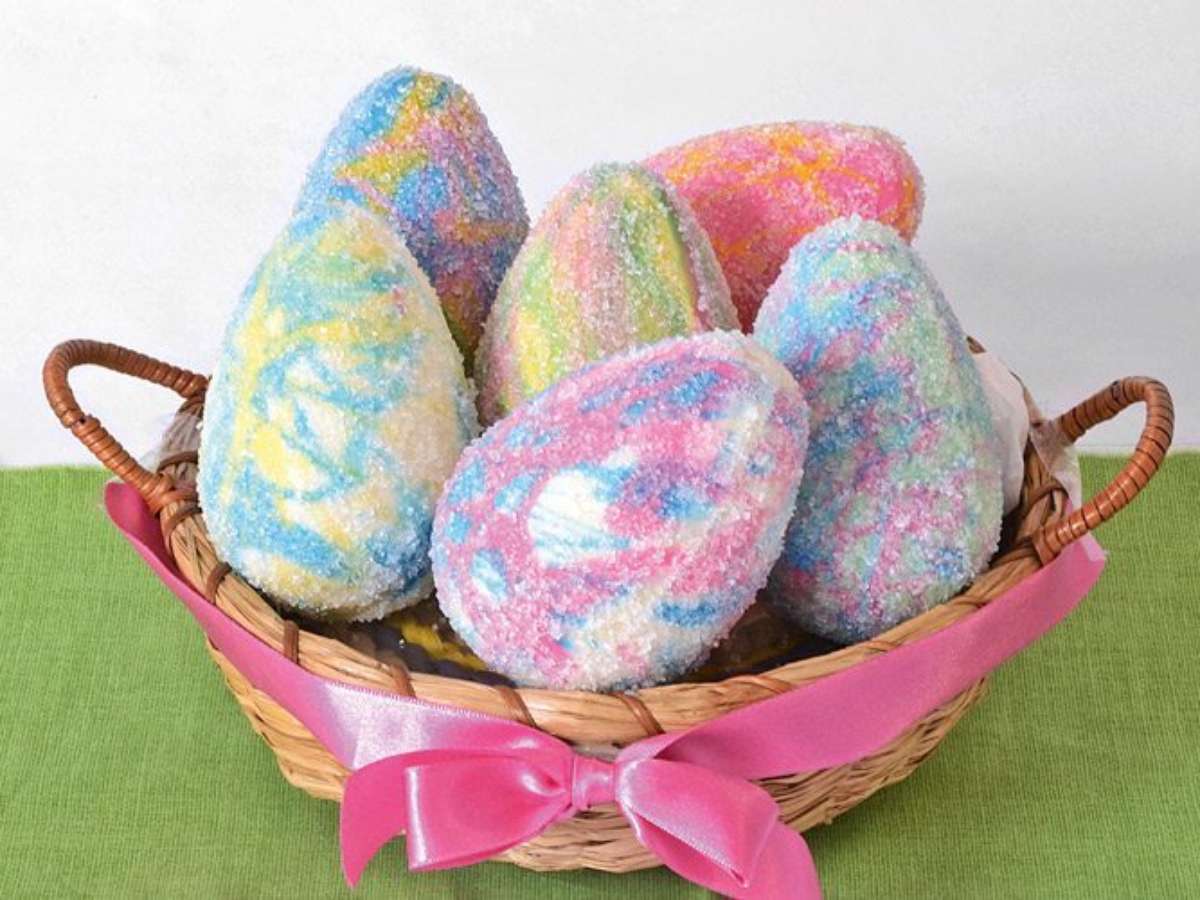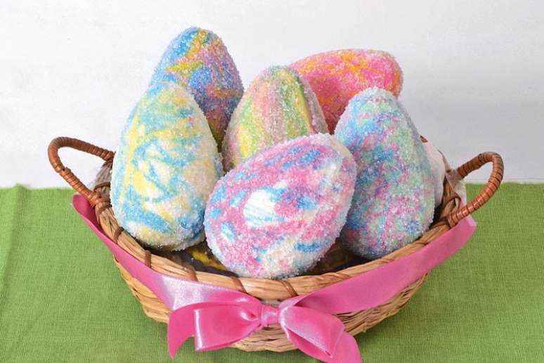 Cubra os riscos coloridos com uma camada de chocolate branco e leve à geladeira por 30 minutos. Retire, pincele mais uma camada de chocolate branco e volte à geladeira por 30 minutos. Desenforme, junte as metades dos ovos, pincele com gel de brilho e polvilhe com açúcar cristal. Sirva em seguida.