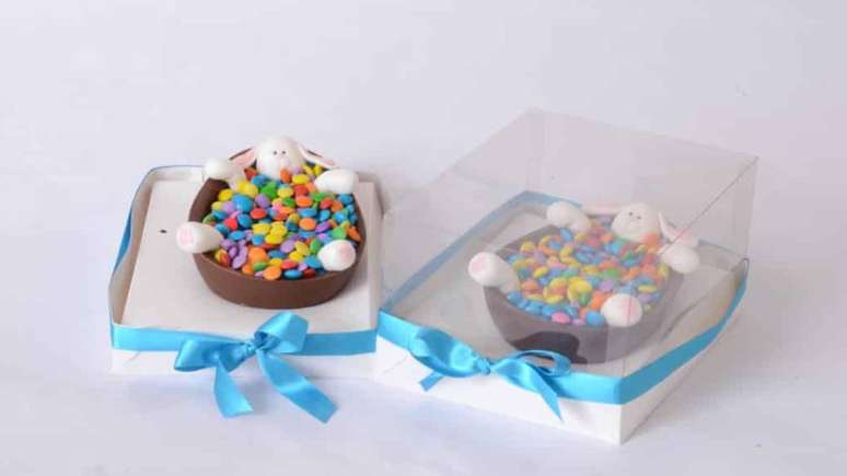- Modele um coelhinho em pasta americana e decore o ovo, como se ele estivesse saindo de uma banheira.