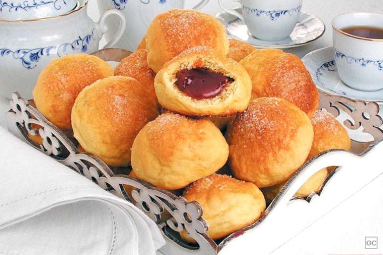 Divida a massa em 30 porções, abra na mão ou com um rolo e divida a goiabada entre elas. Feche, modelando os pãezinhos. Coloque em uma fôrma untada, cubra e deixe descansar por 30 minutos. Pincele com o ovo restante batido, polvilhe com açúcar e leve ao forno médio, preaquecido, por 30 minutos ou até dourar. Retire e sirva.