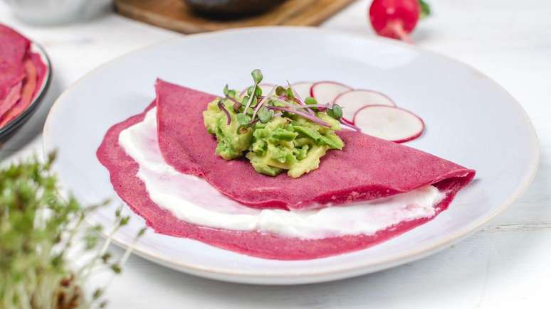 Uma panqueca colorida pede um recheio clássico e cremoso para equilibrar os sabores. O frango desfiado com milho e ervilha é a combinação mais amada.