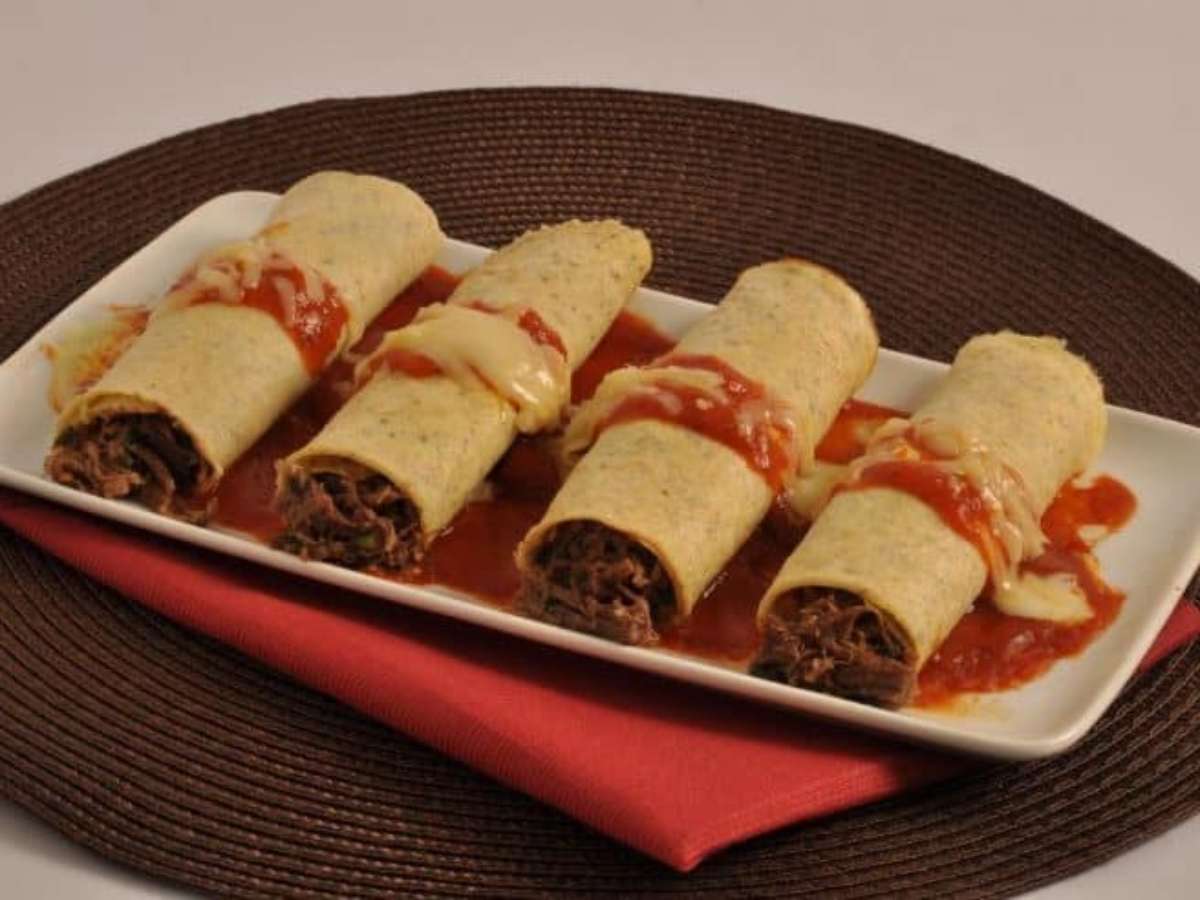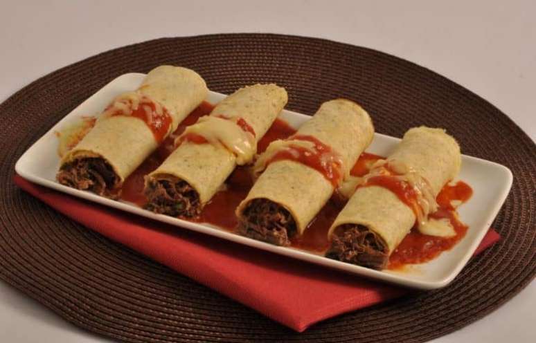 Despeje 1 concha da massa em uma frigideira antiaderente untada e espalhe, cobrindo todo o fundo. Deixe firmar, vire e deixe dourar. Retire e reserve. Repita o procedimento de concha em concha até terminar a massa. Divida o recheio entre as panquecas e enrole como rocamboles. Coloque uma ao lado da outra em um refratário médio, cubra com o molho e polvilhe com a muçarela. Leve ao forno médio, preaquecido, por 5 minutos. Sirva em seguida.