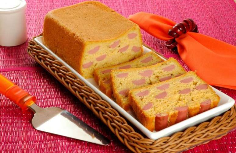 No liquidificador, bata o fubá, a farinha de trigo, o óleo, os ovos, o milho, o creme de leite e o sal. Bata por 3 minutos e acrescente o fermento e o orégano, misturando com uma colher. Em uma fôrma de bolo inglês pequena untada e enfarinhada, intercale massa e salsichas cortadas ao meio no sentido do comprimento. Leve ao forno médio, preaquecido, por 30 minutos, deixe esfriar desenforme e sirva.