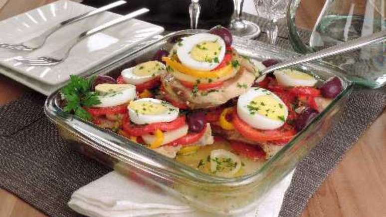 - Faça uma camada com o peixe e faça outra camada com os legumes restantes e o azeite.