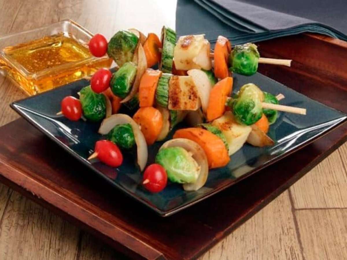 Coloque os legumes e o queijo no espeto intercalando até terminar o palito. Tempere com sal, shoyu, mel e pimenta e leve para grelhar. Sirva.