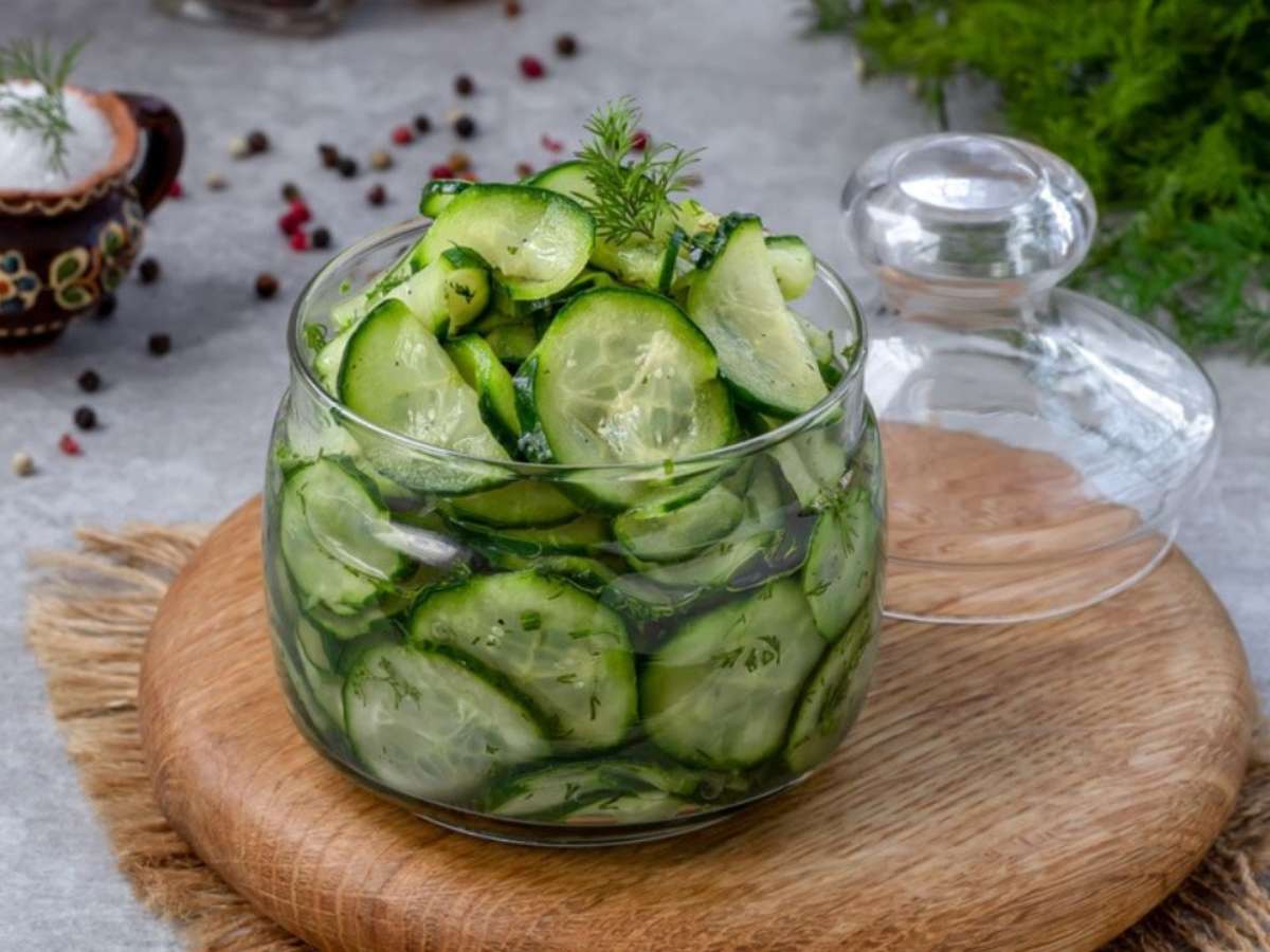 - Água suficiente para cobrir o pote com os pepinos cortados