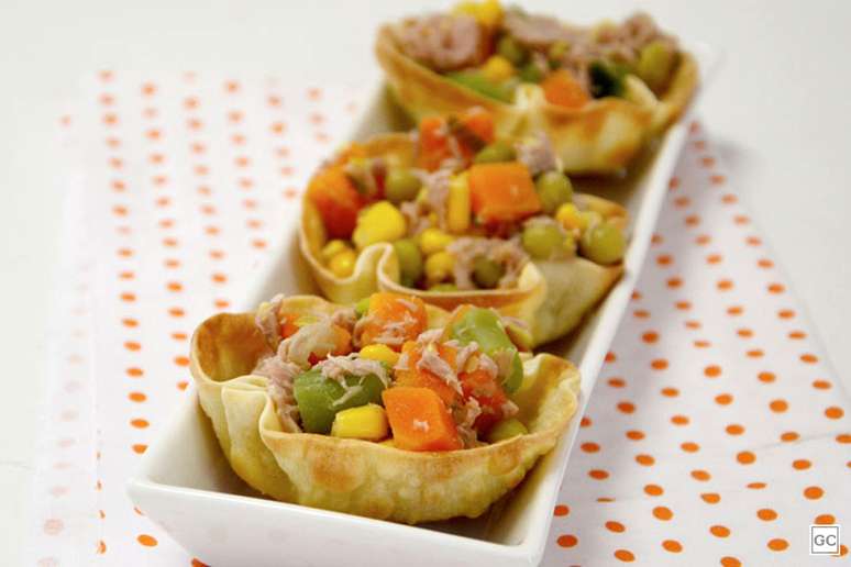 Cestinha de massa de pastel recheada - Foto: Fernando Teixeira Tempo de preparo: 25min Rendimento: 15 unidades Nível de dificuldade: fácil