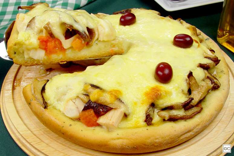 Cubra com um pano e deixe descansar por 1 hora. Em uma frigideira, em fogo médio, aqueça o azeite e refogue o shitake por 5 minutos ou até murchar. Abra a massa sobre uma superfície enfarinhada com um rolo e transfira para uma forma para pizza de 30 cm de diâmetro, untada com azeite.