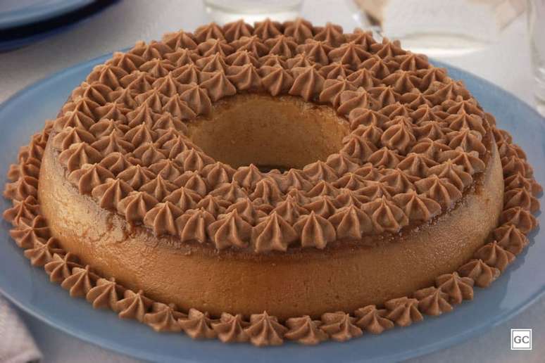 - Desenforme, coloque o doce de leite em um saco de confeitar com bico pitanga e cubra o pudim de maneira decorativa, no topo e na lateral. Sirva.