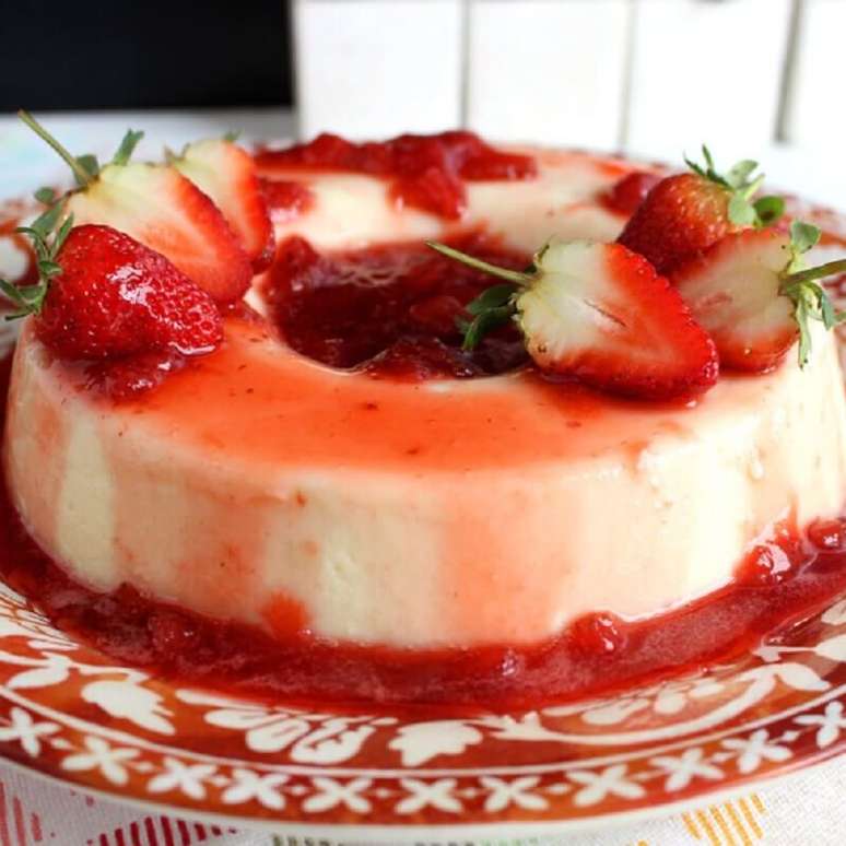 Após desenformar o pudim, basta colocar a calda de morango por cima e servir.