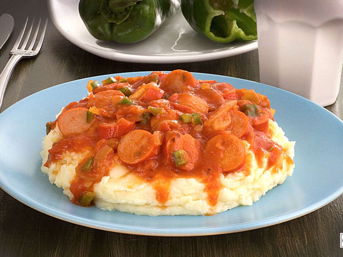 - Coloque em uma travessa, cubra com o molho de salsicha e sirva.