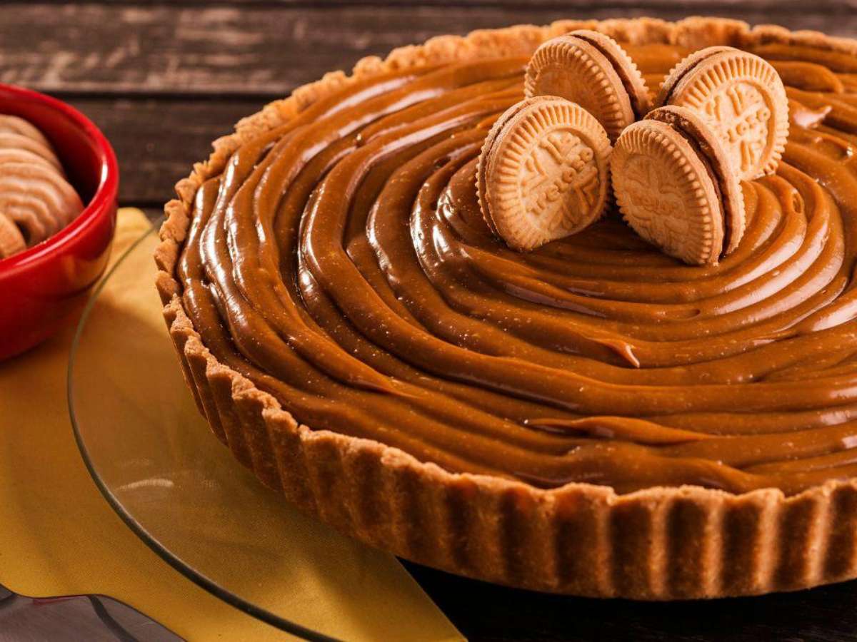 Cubra tudo com as 750g de doce de leite. Finalize decorando o centro da torta com as 4 unidades de biscoito Treloso reservadas.