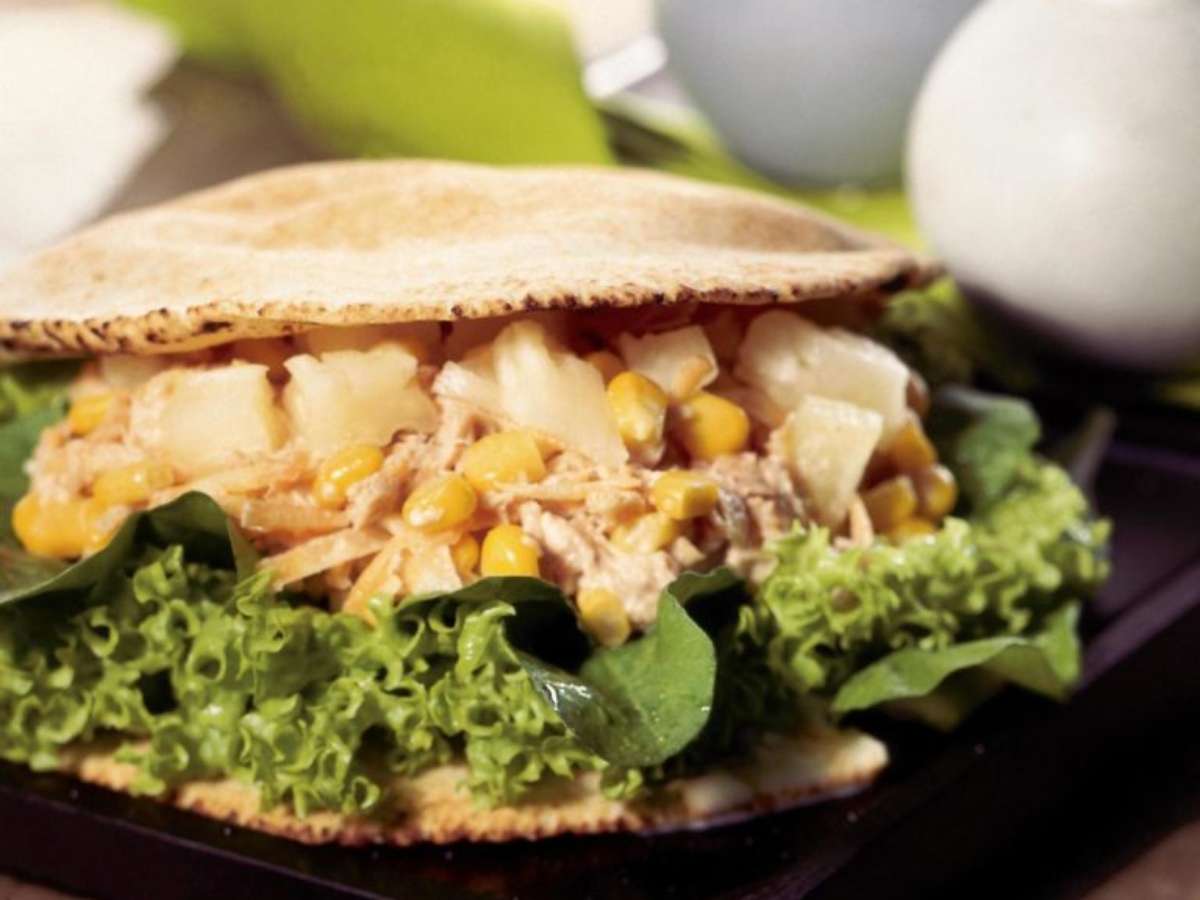 Em uma tigela, misture o atum, o milho, a cenoura e o requeijão e tempere com sal. Separe uma fatia do pão sírio e coloque a alface e a rúcula sobre ela. Espalhe a mistura de atum, cubra com o abacaxi e feche com a outra fatia.