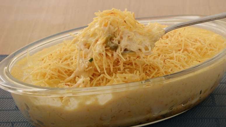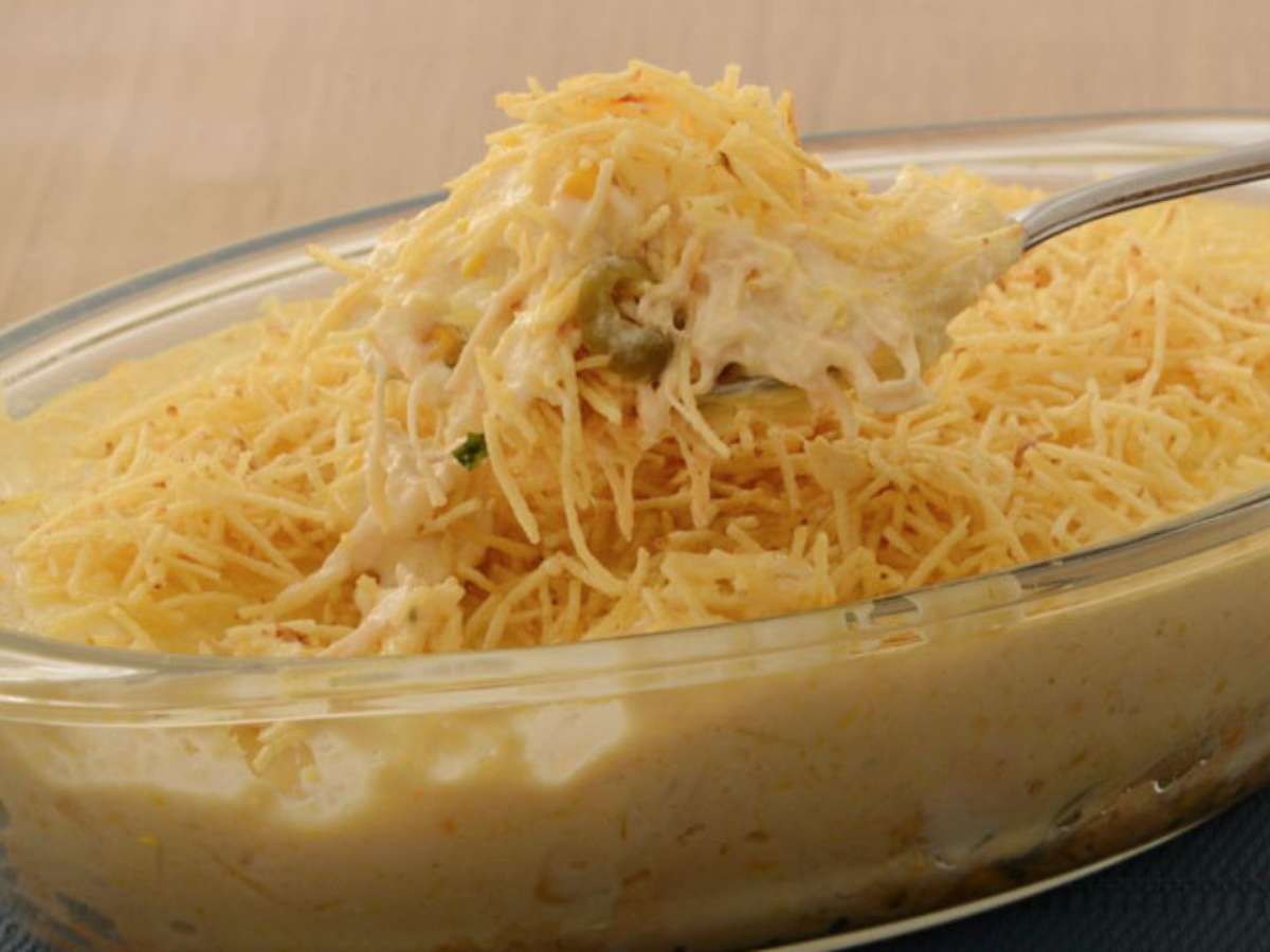 Em uma panela, misture a batata com o creme de leite e a manteiga e leve ao fogo médio até esquentar. Desligue e reserve. Em uma panela, em fogo médio, aqueça o azeite e refogue a cebola e o alho. Adicione o frango e em seguida o molho de tomate. Desligue o fogo e adicione o requeijão e a cebolinha e tempere com sal e pimenta.