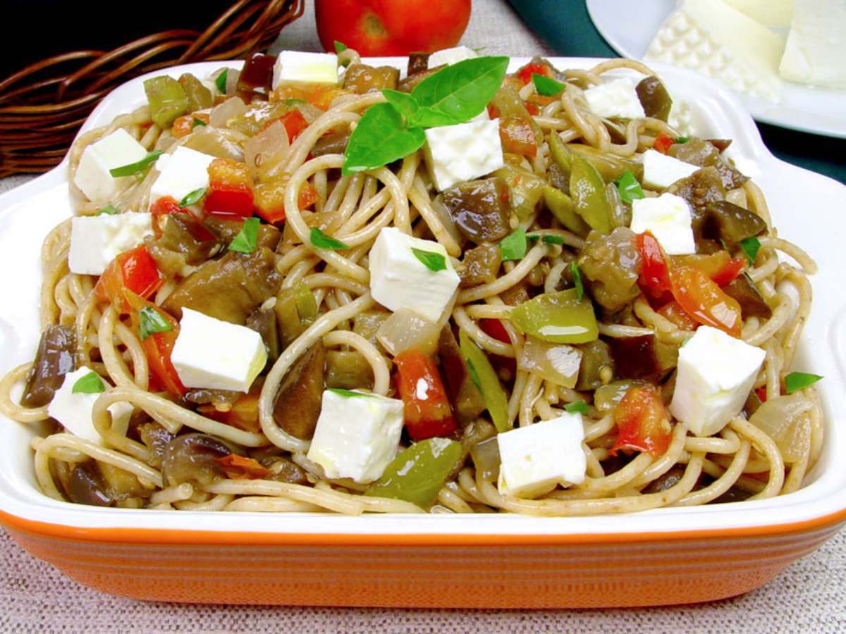 Em uma panela, em fogo médio, cozinhe a massa em água fervente com sal até ficar al dente. Escorra, despeje em uma travessa, cubra com o molho de berinjela, polvilhe com o queijo, manjericão e sirva.