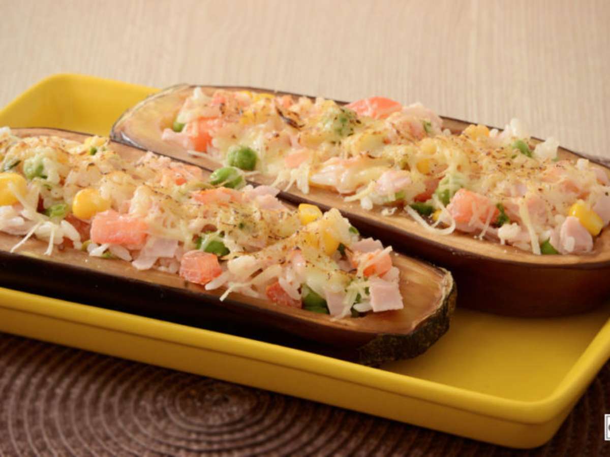 Corte as berinjelas ao meio no sentido do comprimento. Regue com o azeite, coloque em uma fôrma e leve ao forno médio, preaquecido, por 10 minutos. Retire e, com uma colher, retire a polpa das berinjelas, sem furar. Aqueça uma panela com a manteiga, em fogo médio, e doure a cebola. Adicione o arroz, o milho, a ervilha, o tomate, o presunto, a azeitona, sal, cheiro-verde e refogue por 3 minutos. Desligue e misture com o requeijão e a muçarela. Divida o recheio entre as berinjelas, polvilhe com a farinha de rosca misturada com o parmesão e leve ao forno médio, preaquecido, por 10 minutos ou até dourar. Retire e sirva.