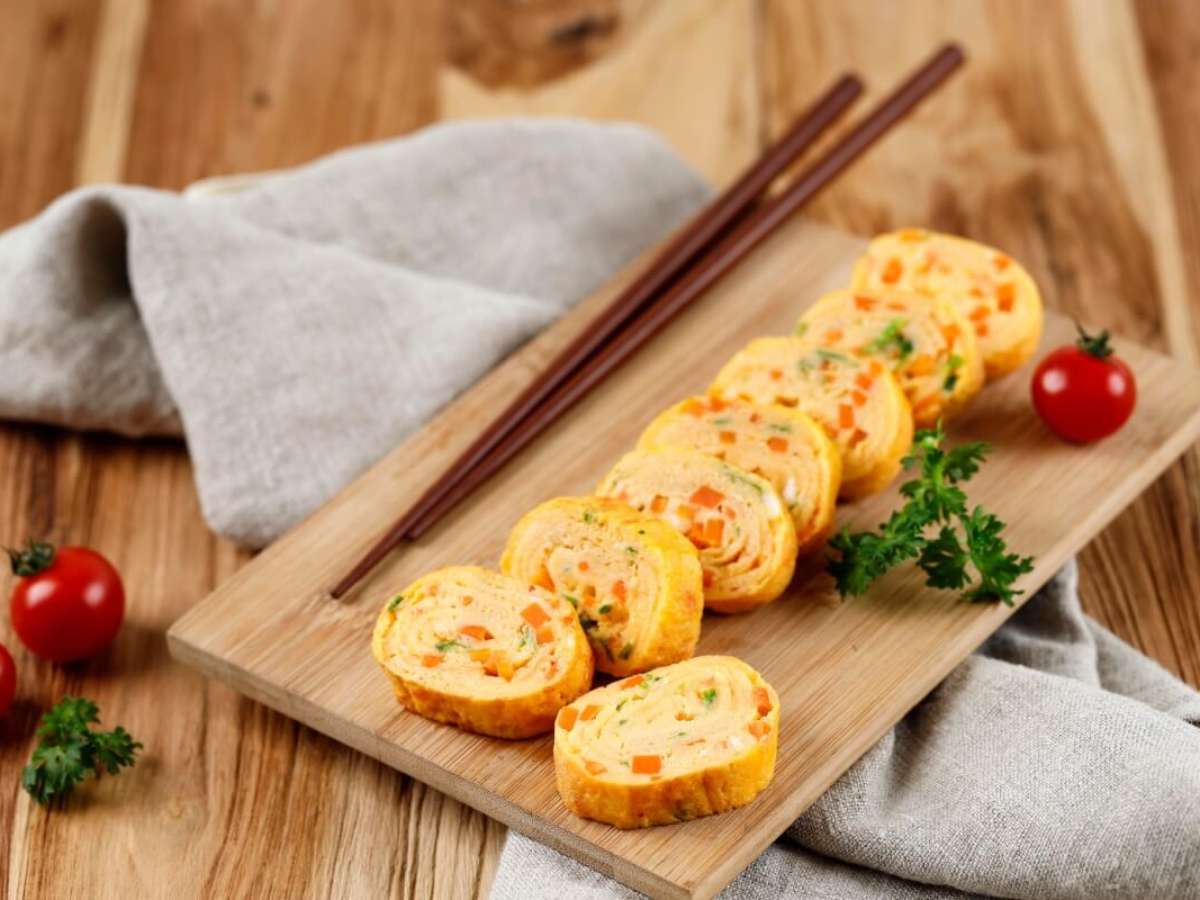 Com a ajuda de uma espátula de silicone, enrole a omelete de um lado ao outro, formando um rolinho, e empurre-o para um lado da frigideira. Adicione mais um pouco da mistura de ovos, espalhando até encostar no rolinho já formado. Assim que firmar, enrole novamente sobre a primeira parte. Continue adicionando camadas finas de ovos e enrolando até utilizar toda a mistura. Retire o rolinho pronto da frigideira e deixe descansar 2 a 3 minutos. Em seguida, corte em fatias de cerca de 2 cm e sirva.