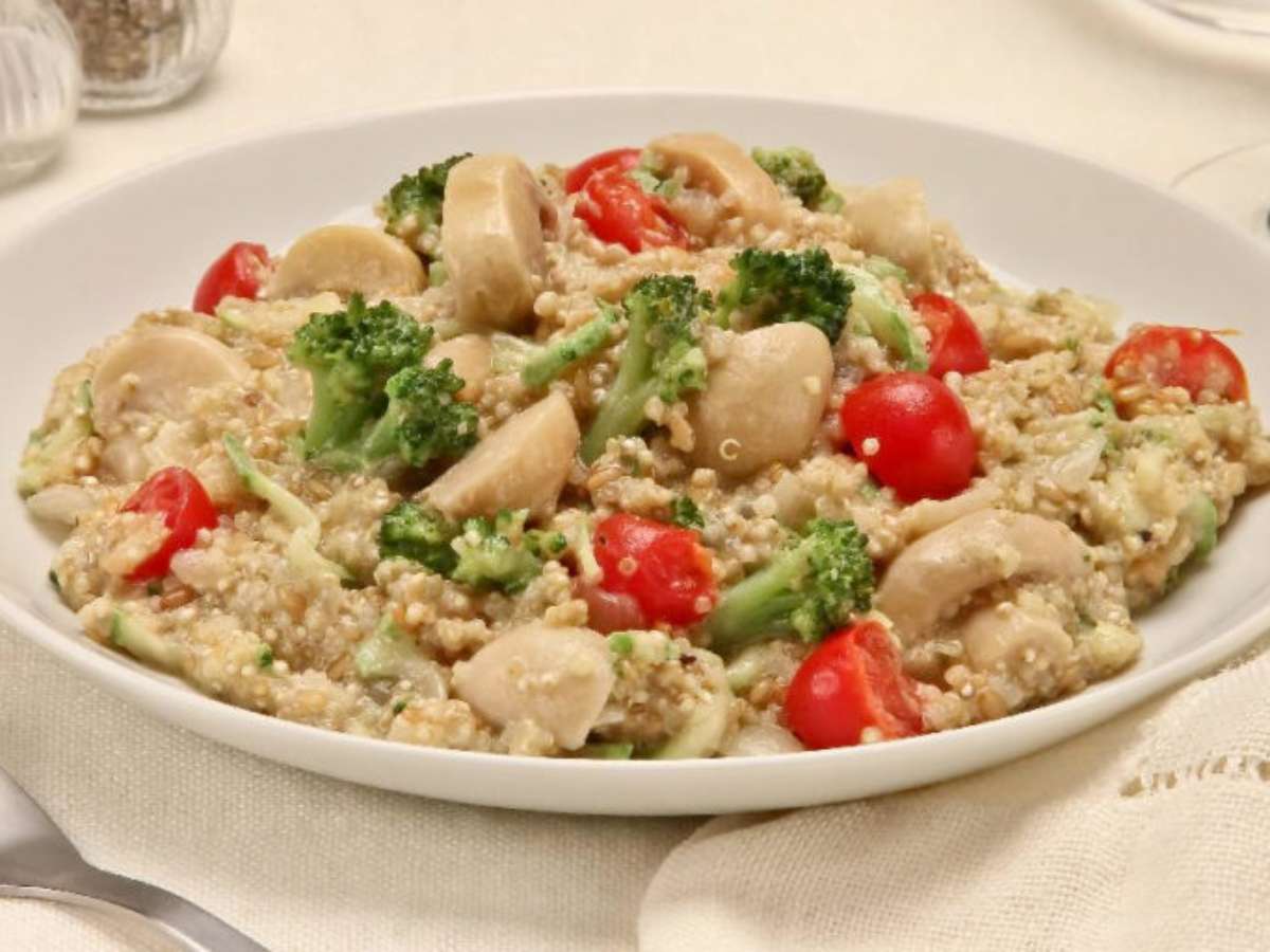Aqueça uma panela grande e larga com a manteiga e o azeite, em fogo médio. Refogue a cebola e o alho em fogo baixo por 2 minutos, sem dourar. Despeje a quinoa e a linhaça e regue com o caldo dissolvido na água quente (aproximadamente 1 concha), mexendo até secar. Continue regando e mexendo por 15 minutos ou até a quinoa ficar al dente. Acrescente a abobrinha, o brócolis, o champignon e o tomate. Cozinhe por 2 minutos e tempere com sal e pimenta a gosto. Misture o creme de leite e sirva.