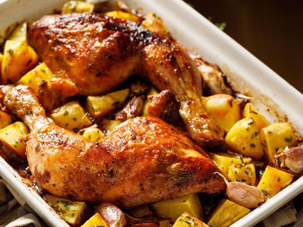 Sobrecoxa com batatas assada em uma só forma