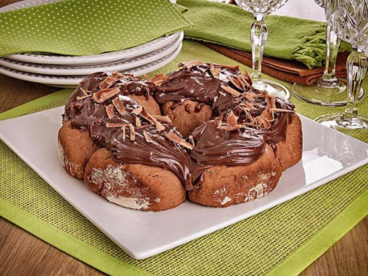 Em uma tigela, misture o fermento, o açúcar e o leite morno até dissolver. Adicione o óleo, o chocolate em pó, os ovos, o sal e misture. Junte a farinha, aos poucos, até formar uma massa que desgrude das mãos. Se necessário, acrescente mais farinha. Cubra e deixe descansar por 1 hora. Modele bolinhas e coloque em uma fôrma redonda untada e enfarinhada, uma ao lado da outra, deixando pouco espaço entre elas. Leve ao forno médio (180º C), preaquecido, por 30 minutos ou até dourar levemente. Retire e deixe esfriar. Para a cobertura, em uma panela, em fogo médio, cozinhe o leite condensado, a manteiga e o chocolate em pó, mexendo até desgrudar levemente do fundo da panela. Junte o creme de leite, misture e deixe esfriar. Cubra o pão com o brigadeiro e polvilhe com raspas de chocolate. Sirva.