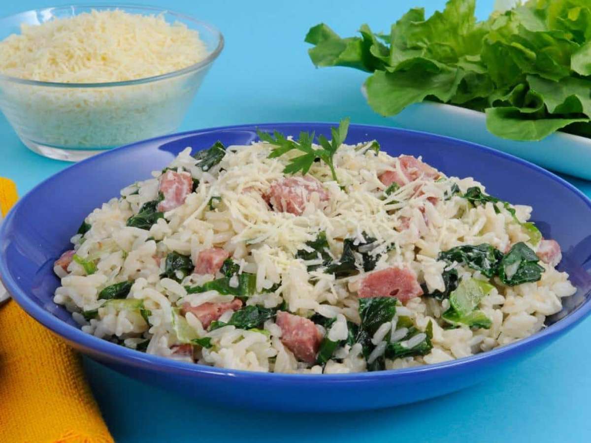 Em uma panela, refogue a cebola, o alho e a escarola no óleo até a verdura murchar. Acrescente a calabresa, o arroz, o caldo de legumes, a água, a pimenta-do-reino e cozinhe em fogo baixo por 5 minutos. Desligue o fogo, misture o creme de leite, cubra com o parmesão e sirva em seguida.