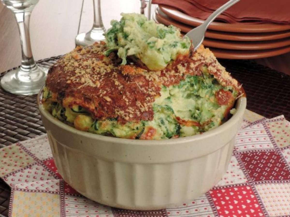 Desligue, misture com o gorgonzola e deixe amornar. Na batedeira, bata as claras em neve com uma pitada de sal e misture delicadamente ao suflê. Transfira para um refratário médio untado, cubra com o parmesão e leve ao forno médio, preaquecido, por 30 minutos.
