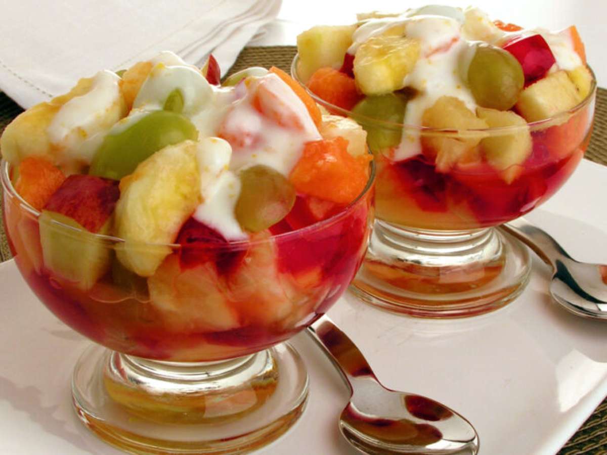 Misture todas as frutas e coloque em taças de sobremesa junto com a gelatina. Adicione o suco de laranja e mexa. Para a cobertura, misture todos os ingredientes com uma colher. Cubra as frutas com o creme de iogurte e sirva em seguida.