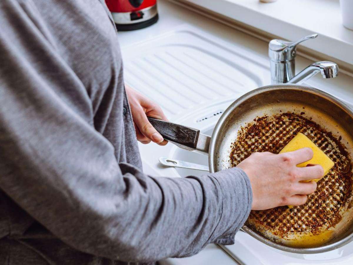 Muitas pessoas usam facas para raspar o fundo das panelas sujas. Isso cria sulcos profundos que acumulam ainda mais gordura depois.