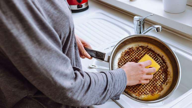 O calor ajuda a soltar os resíduos carbonizados mais difíceis. Depois, basta passar a bucha com sabão para finalizar o brilho.
