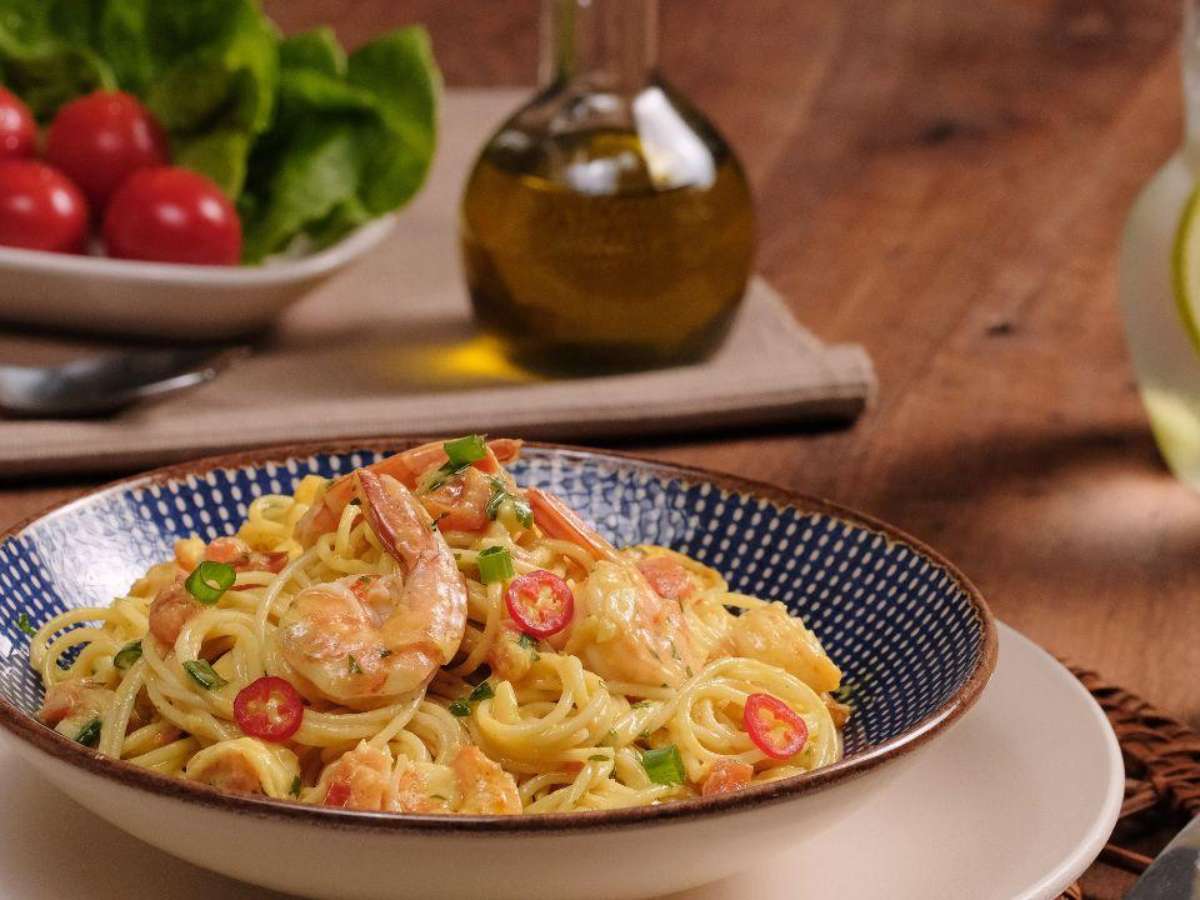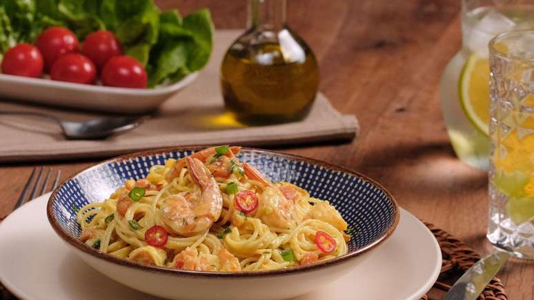 O preparo leva apenas 40 minutos e rende duas porções generosas. Siga as etapas para não errar no ponto dos camarões.