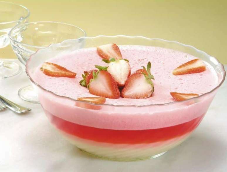 Leve ao fogo o leite condensado, as gemas e a maisena dissolvida no leite. Depois do creme pronto, coloque em um refratário. Dissolva a gelatina na água fervente e acrescente a água em temperatura ambiente. Com as claras, bata um suspiro (para virar suspiro, é preciso que bata as claras em neve com o açúcar) e junte à gelatina. Despeje sobre o creme no refratário. Leve à geladeira por 3 horas ou até endurecer a gelatina. Decore com morangos.