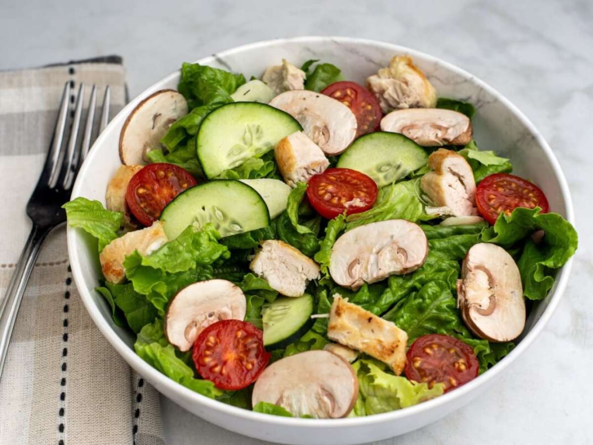 Em um recipiente, tempere o peito de frango com sal e pimenta-do-reino. Em uma frigideira, aqueça um fio de azeite em fogo médio e grelhe o frango até ficar dourado e bem cozido. Retire e corte em fatias. Na mesma frigideira, coloque o cogumelo e cozinhe até ficar macio. Reserve. Em uma tigela, coloque as folhas de alface. Adicione o pepino, o tomate-cereja e o cogumelo. Acrescente o frango por cima. Tempere com azeite, suco de limão, sal e pimenta-do-reino. Misture delicadamente e sirva em seguida.