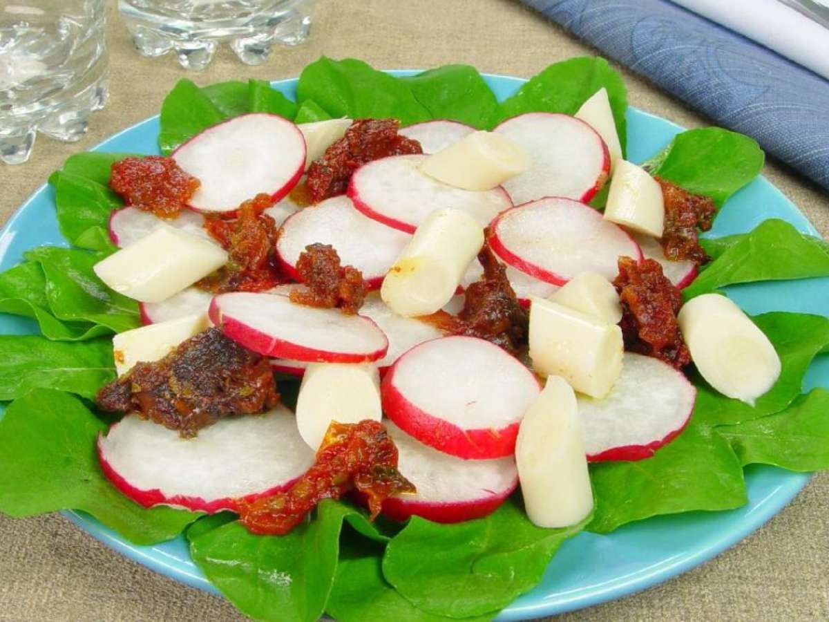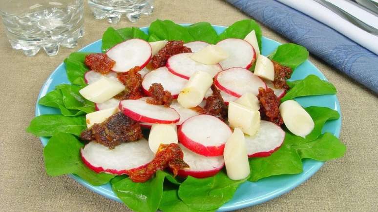 - Em uma saladeira, coloque a rúcula, espalhe o tomate seco, o palmito e cubra com o rabanete.