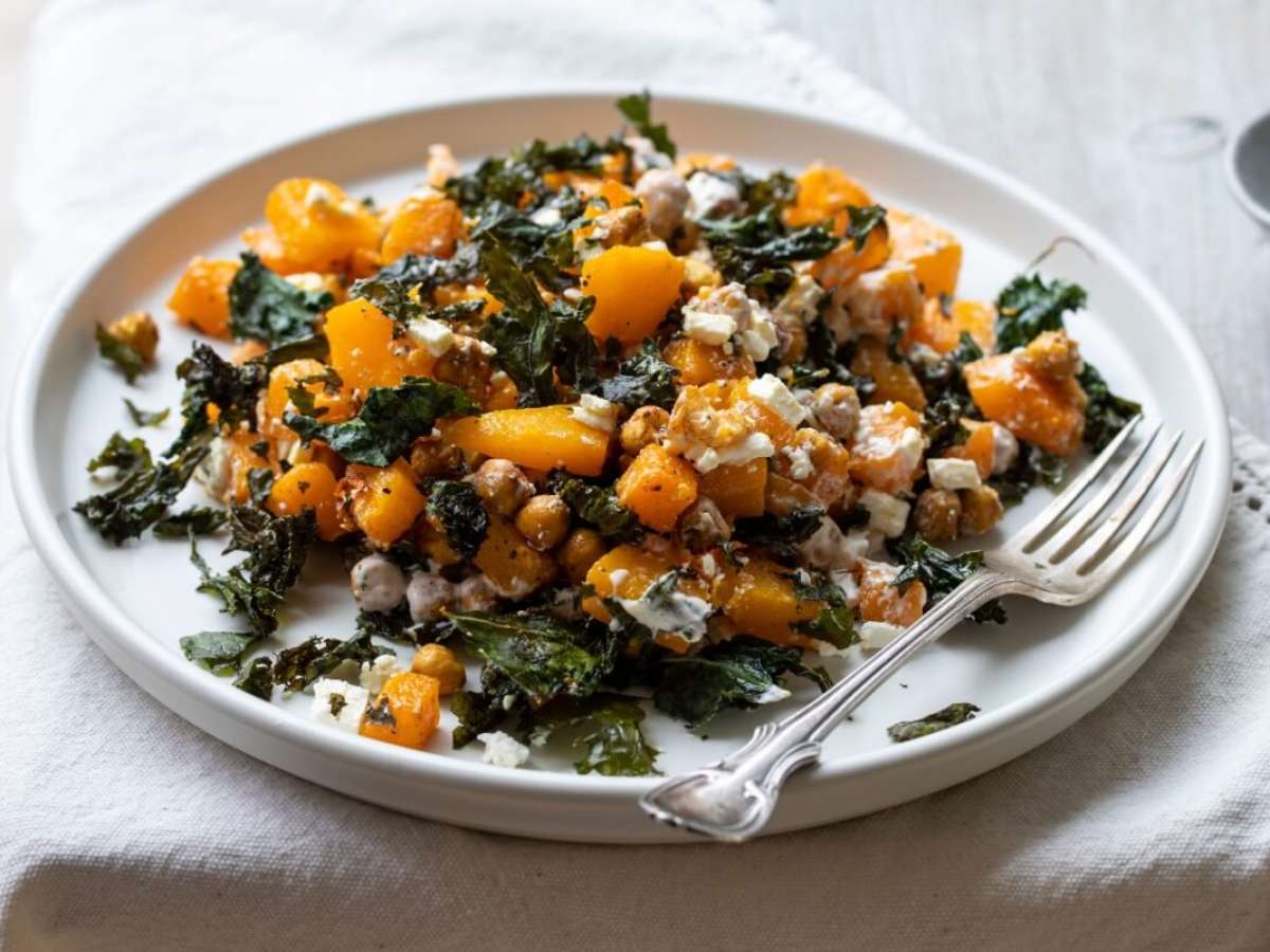 Salada morna de abóbora com couve e grão-de-bico