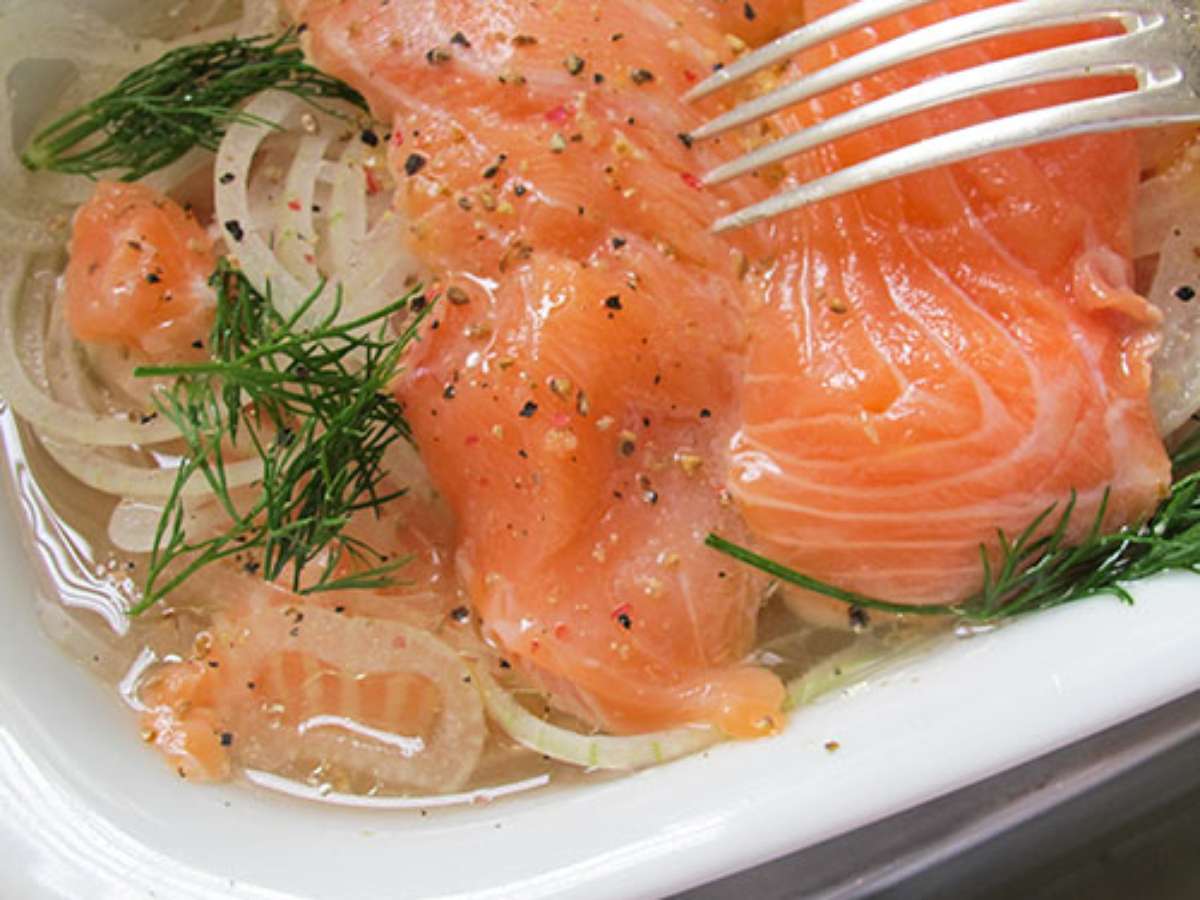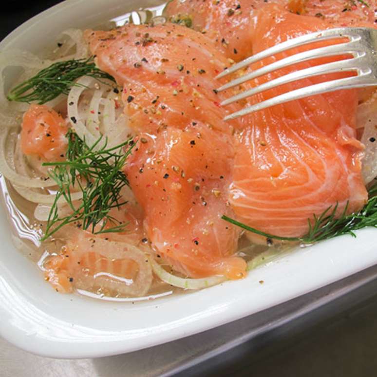 - Distribua um terço das fatias de salmão pelo fundo de um travessa de cerâmica ou porcelana, cubra com um terço da cebola, espalhe dois ou três galhos de dill (aneto), cubra com mais uma camada de salmão e de cebolas, mais uns galhos de dill e por fim a última camada de salmão e cebola. Molhe bem com o molho previamente preparado e guarde na geladeira até a hora de servir.