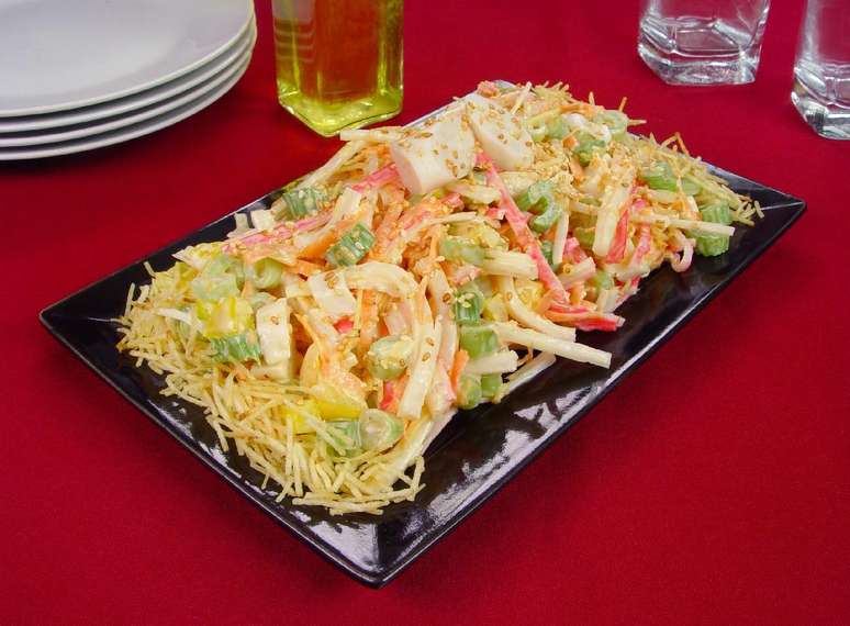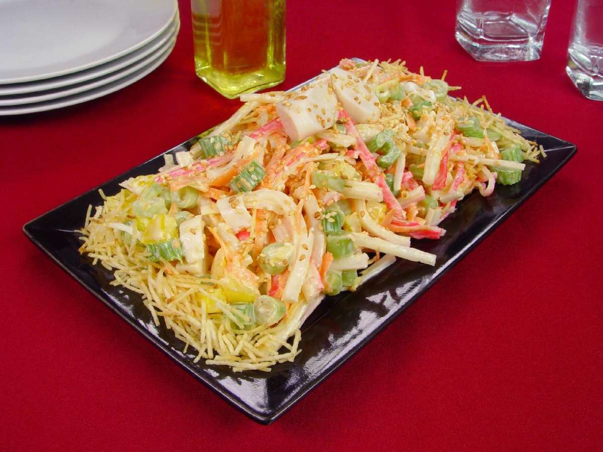 Em uma tigela, coloque o kani kama, o shoyu, a cenoura, o palmito, a vagem, o pimentão, o salsão e a maionese. Tempere com sal e misture. Leve à geladeira por 1 hora. Retire, acrescente a batata palha e transfira para uma travessa. Decore com gergelim e sirva em seguida.